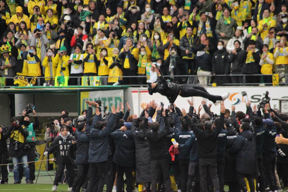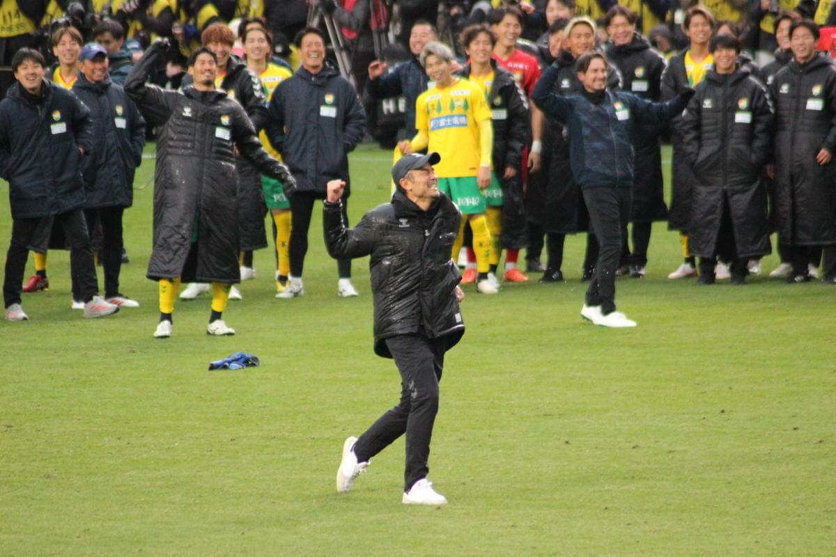 胴上げされ、そして全ての感情を解き放つかのように渾身のジェフ三唱でガッツポーズを突き上げ叫んだ小林監督。スタンドもまた、あらん限りのジェフ三唱で応えた。